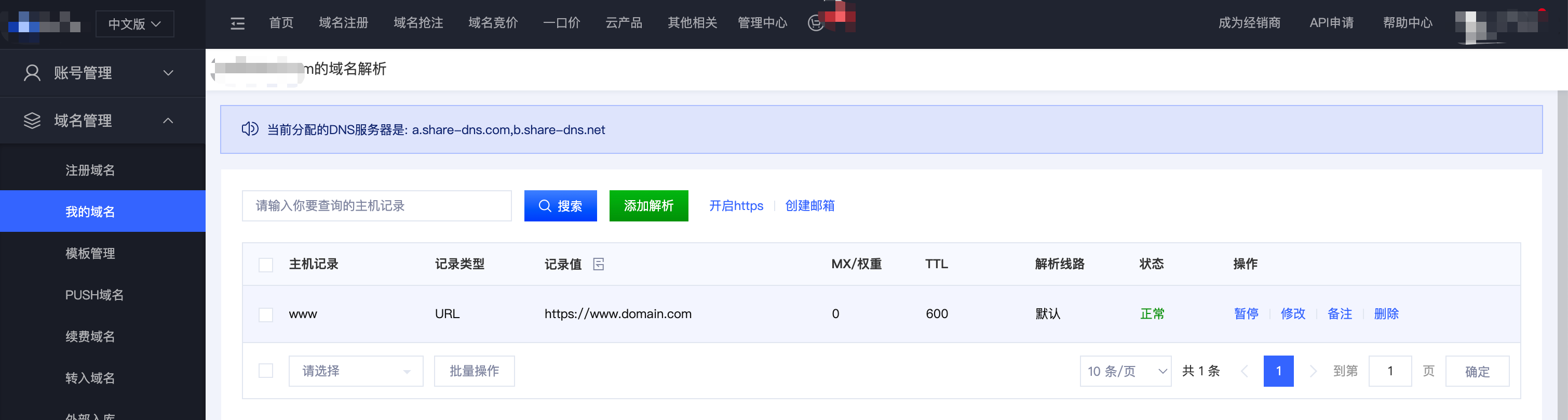 记录值输入别名地址,隐藏实际的URL地址,例如:https://www.domain.com;