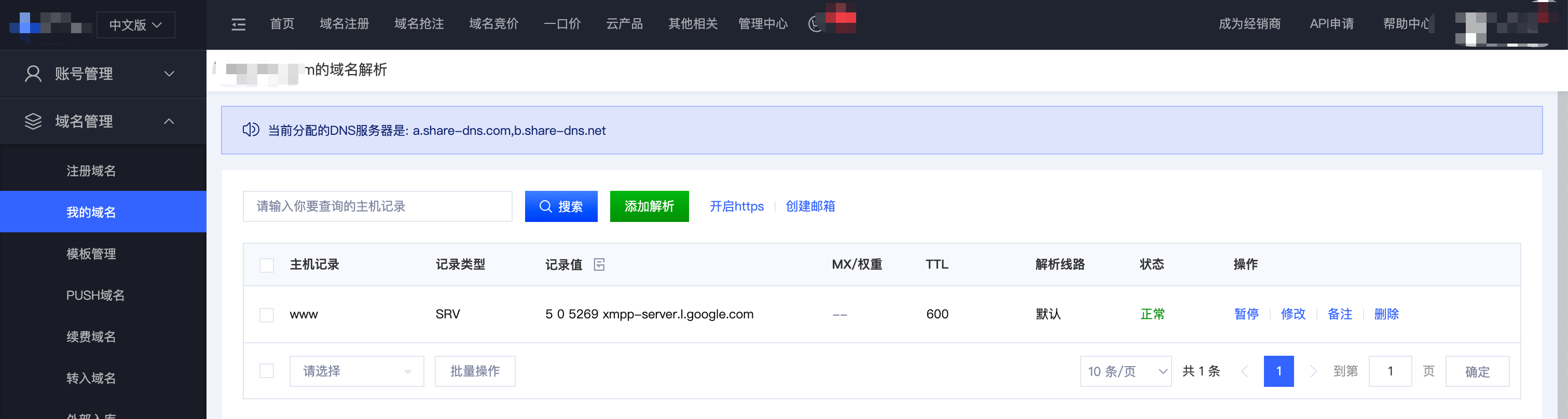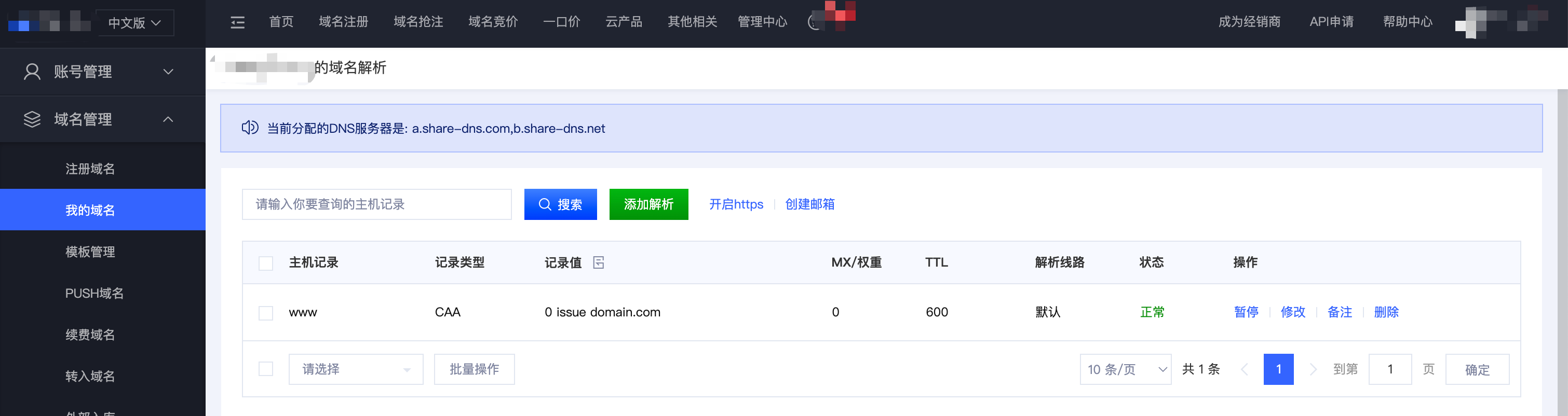1、进入【域名管理】-【我的域名】-【解析】,点击“添加解析”。