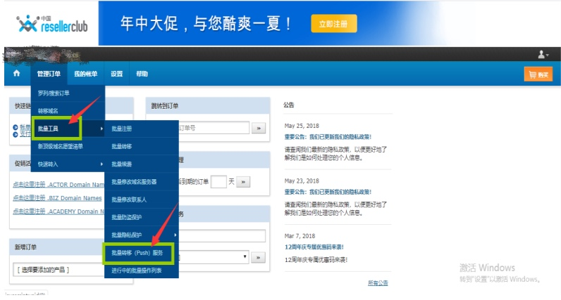 2.在管理订单的下拉菜单栏里选择【批量工具】,再选择【批量转移(Push)服务】。