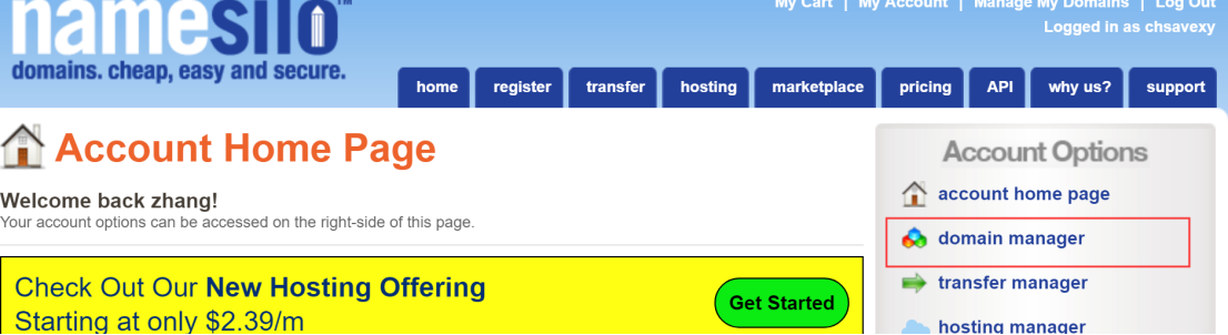 1.登陆namesilo账户,进入我的账户页面,点击【domain manager】进入我的域名列表;