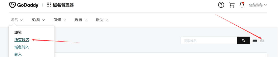 1.登陆GD账户,点击域名二级菜单栏的【所有域名】进入域名管理界面,点击搜索框右边的高级列表视图。
