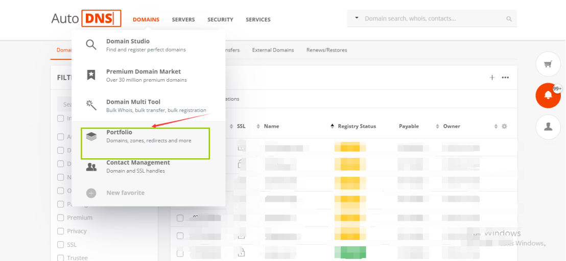1.登录InternetX账户,点击【Domains】,在下拉菜单里找到并点击【Portfolio】;