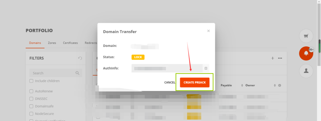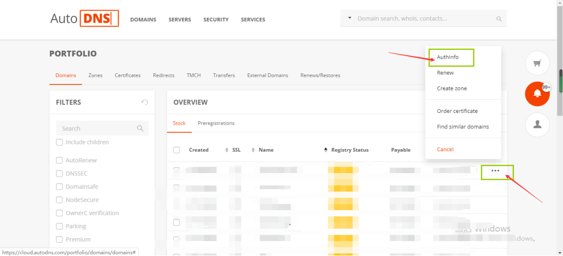 2.选择任一域名,点击域名右侧的三个小点点,在下拉菜单里找到并点击【AuthInfo】;