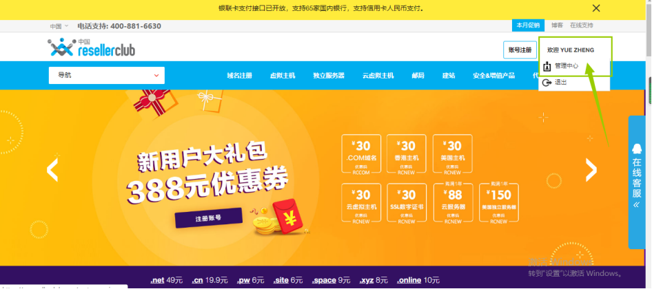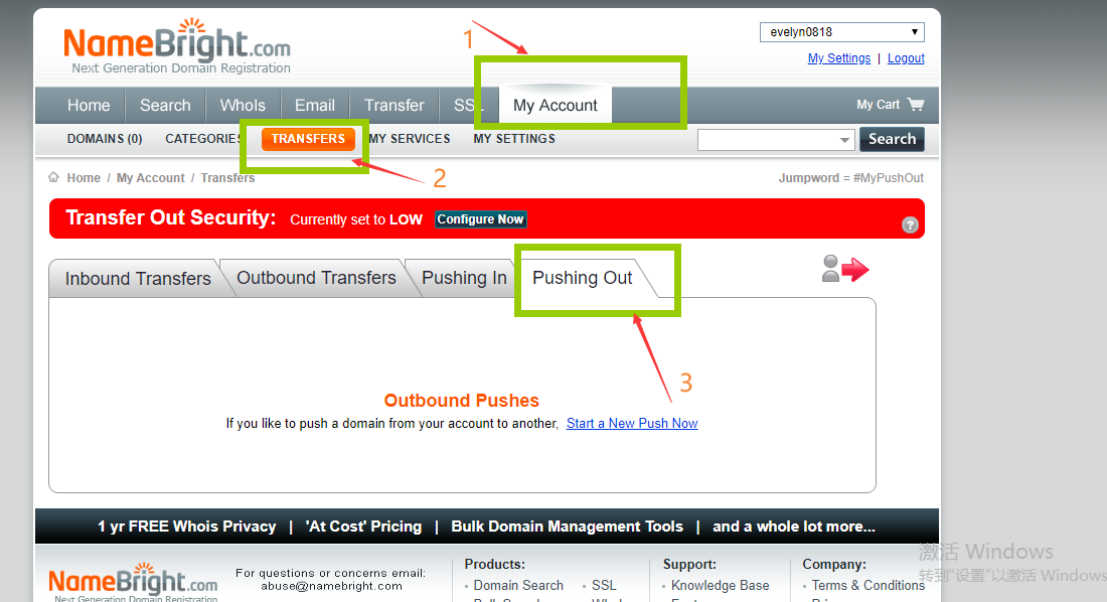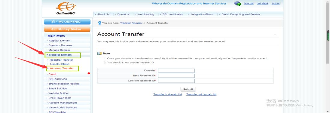 登录账户后进入后台管理中心,在左边菜单栏找到并点击【Transfer Domain】,然后点击下拉菜单里的【Account Transfer】,输入域名及接收者ID即可push域名(注:域名将在接收PUSH者账户下自动续费一年)