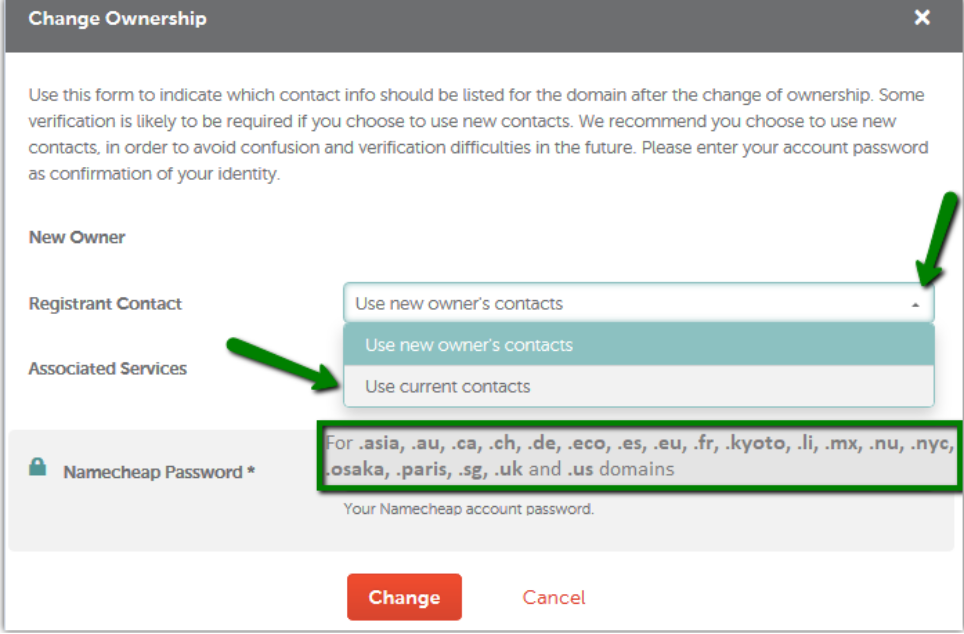 在【Registrant Contact】的下拉菜单栏里选择【Use current contacts】,然后填写您的账号密码进行授权,如果信息都填写正确,您的域名将被PUSH。