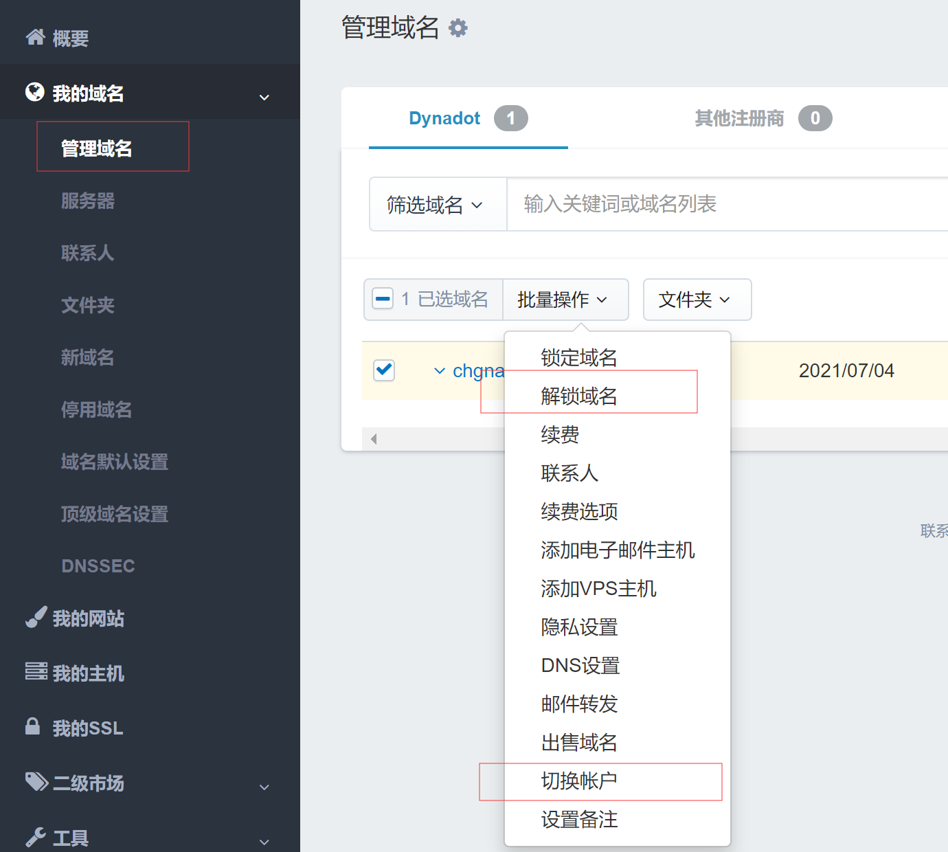 1、登陆Dynadot账户,进入【管理域名】选中您需要PUSH的域名点击批量操作里面的【解锁域名】进行解锁。