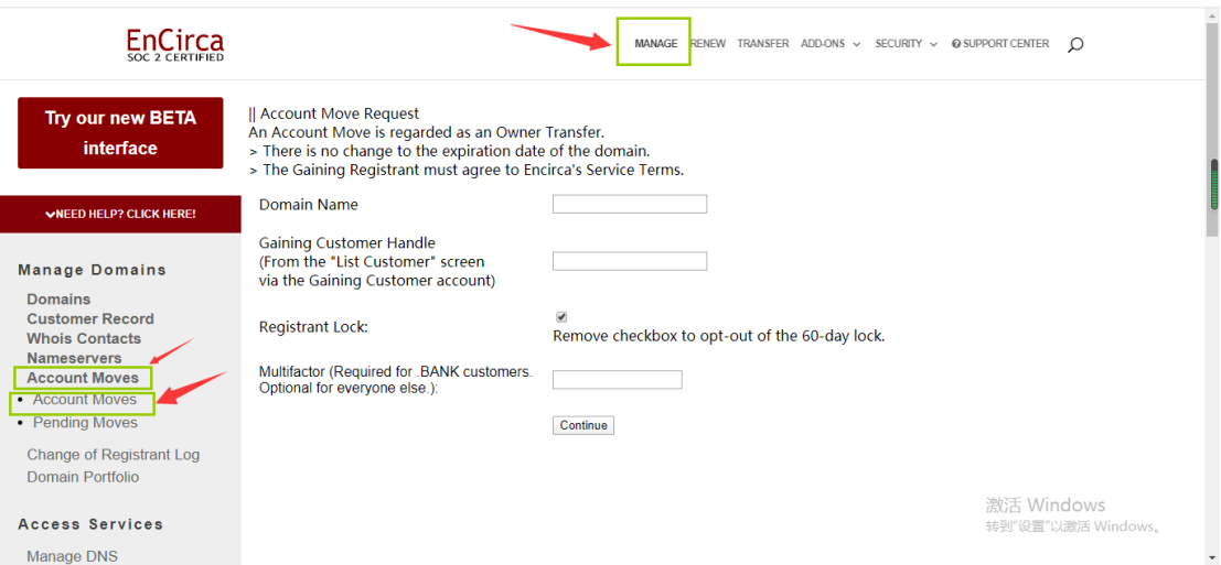 登陆后点击【MANAGE】进入相关页面,然后在左侧菜单栏里找到【Account Moves】并点击其下拉菜单里的【Account Moves】,即可进入PUSH域名页面。
