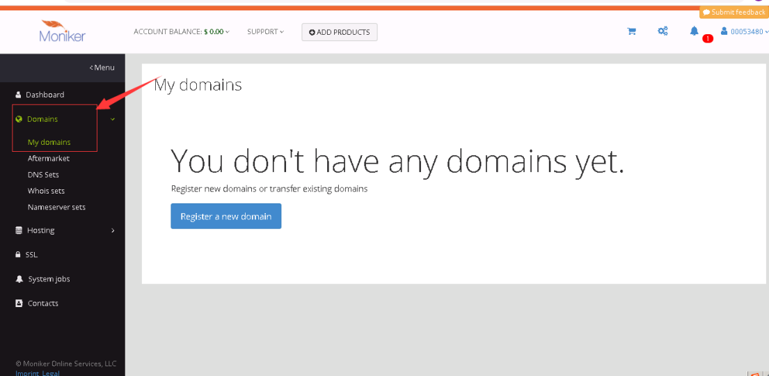 1.登陆账户,进入管理中心,找到并点击【Domains】,然后点击下拉菜单栏里的【My domains】。