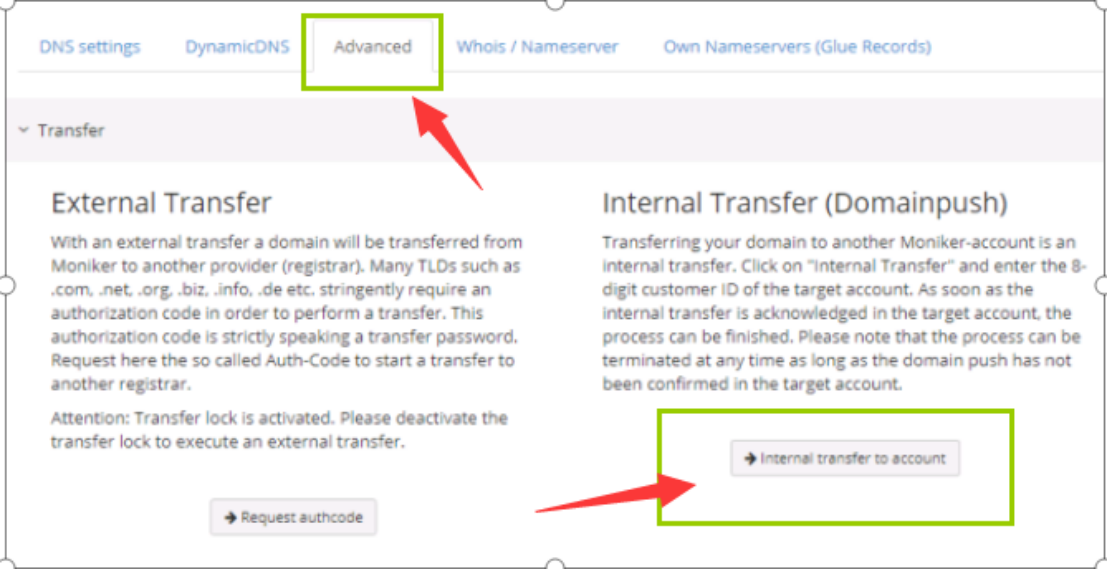 2.勾选你想要PUSH的域名,选择工具栏里的【Advanced】,然后点击右边的【Internal transfer to account】。