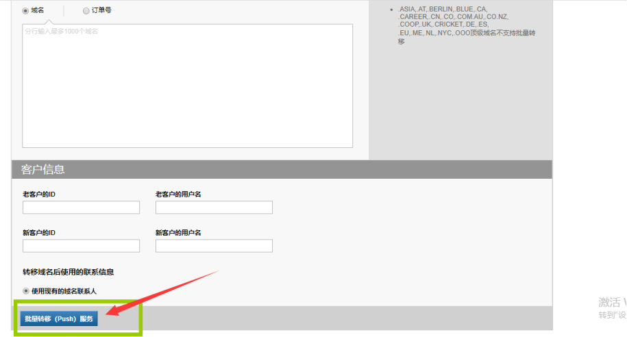3.填写域名以及PUSH双方的ID和用户名,点击【批量转移(Push)服务】即可。