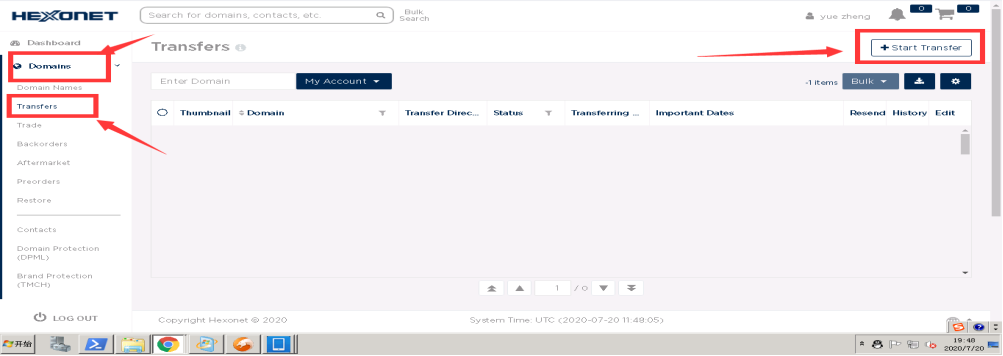 登录账号后进入管理中心,选择并点击【Domains】,然后选择下拉菜单栏里的【Transfers】,最后点击页面右上角的【Start Transfer】即可,系统会自动识别您是操作转移域名还是PUSH域名